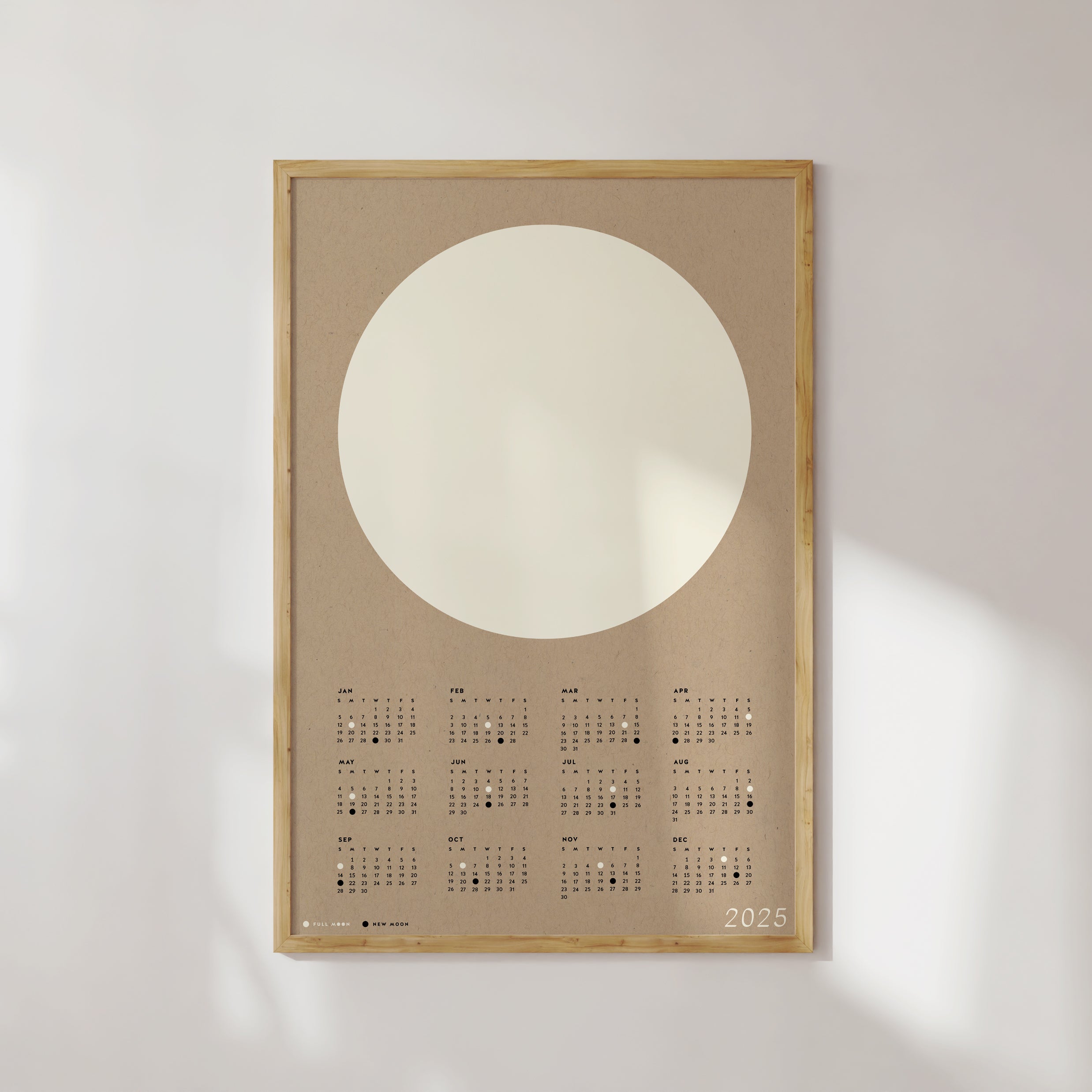 In true minimalist fashion, this calendar focuses on the two most significant moon phases - the full and new moons. A simple and fresh monthly calendar layout allows you to see at a glance what days of the month they fall on.
